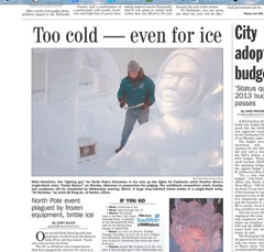 It is too cold, even for the North Pole. You’d think cold weather would be great for a festival based around ice. But the Fairbanks Daily News Miner says the Alaskan city’s annual ice sculpture event has been plagued by frozen equipment and brittle ice, results of 30- to 40-below-zero degree weather. Several sculptors have had to bring their ice creations inside to warm them up enough to be finished, say event organizers.