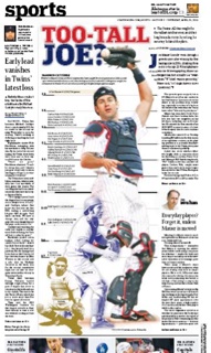 The Star Tribune says the Twins’ Joe Mauer may be the tallest catcher ever to play in the majors. But at 6’6 (in shoes) is he too tall to play his position? Experts say part of the problem is that being tall puts an extra strain on a person’s joints—“every extra pound adds an extra three to five pounds to what a lower extremity joint feels”—a serious strain for someone who crouches for a living. The too tall question keeps popping up because Mauer keeps finding himself on the team’s disable list, this time for something referred to as a “bilateral leg weakness.”