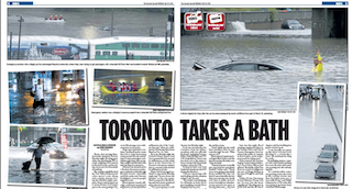 Toronto was hit with a record amount of rain yesterday, says the Sun, making it the wettest day the city has seen in 50 years. Meteorologists blamed slow-moving thunderstorms for the deluge which caused massive flooding and led to “harrowing scenes” around the city. People abandoned their cars on the road as the rain kept pelting down and firefighters were forced to rescue dozens of passengers from stranded cars and trains.