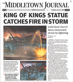 Jesus was struck by lightning in Ohio last night. Known to locals as the “touchdown Jesus,” the iconic 62-foot statue along Route 75 caught fire and burned down to its steel frame says the Middletown Journal. Onlookers noted that the sign to an adult video store across the street, Hustler Hollywood, remained untouched during the storm.