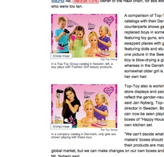 The European company Top Toy has done something new in Sweden, says the Wall Street Journal: a gender neutral toy catalog. The company made the switch after receiving criticism from the country’s top advertising watchdog. In Denmark, however it’s business as usual. The Journal prints side-by-side shots of the same catalog—in the Danish version girls are featured doing traditionally girl things while in the Swedish version “girls brandish toy guns and boys wield blow-dryers.”