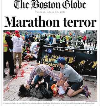 Tragic photos from the Boston marathon bombings appear on virtually every front page in the nation this morning. The Boston Globe says their city, which is renown for its hospitals, faces an unprecedented challenge as doctors rushed to treat injuries usually only found in war zones. The paper says patients started arriving at the city’s emergency rooms with missing limbs, shrapnel wounds and perforated eardrums yesterday afternoon. So far three casualties have been reported, including an eight-year-old boy, and more than 130 people have been injured. SEE GLOBE REPORTER DESCRIBE THE CHAOS