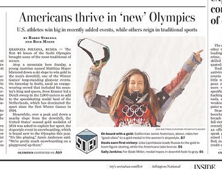 Jamie Anderson is the big American story of the Olympics so far, helping the U.S. sweep the first-ever Olympic slopestyle snowboarding competition. The Washington Post says the U.S. dominates these new Olympic sports. Since snowboarding was introduced in 1998, the U.S. has won one-third of the medals awarded in snowboarding events.