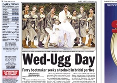 Australian company Uggs is trying to get a piece of the booming wedding market, so they’ve introduced a bride-friendly version of their ubiquitous furry boot. Actually, two versions—one with glitter fabric and one covered with Swarovski crystals The New York Daily News says there’s also fluffy flip-flops. Here’s what I have to say about that: ugh.