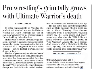 The professional wrestling world was shocked this week to learn of the death of the wrestler known as the Ultimate Warrior. The Washington Post’s Paul Farhi says the 54-year-old Warrior, who was born James Hellwig, is one of more than five dozen wrestlers who died before his time. He says wrestlers have a mortality rate that would be considered a crisis if it were any other sport like boxing or racecar driving.