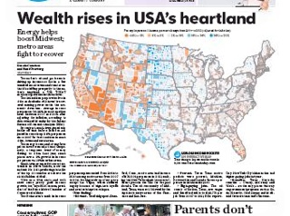 There’s a pretty fascinating map on the front page of USA Today this morning, showing how the middle of America has had big income gains in the past five years. Oil and gas production gets much of the credit for the boom, which is “driving up income so fast in a few hundred small towns and rural areas that it’s shifting prosperity to the nation’s heartland.” An example: the average income in Sully County, South Dakota ($116,067) now almost rivals the average income in Manhattan ($121,301).