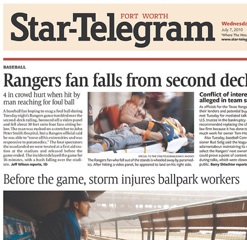 Footage from last night’s Texas Rangers game doesn’t show the night’s most talked about moment says the Fort Worth Star-Telegram. But it does catch the reaction of fans and players as they watch a man fall thirty feet from the second level of the stadium to the first. In an attempt to catch a foul ball, the man leaned over the railing too far but luckily, no one, not the man nor the people he landed on, was seriously injured. The paper says this isn’t the first time this has happened. Railings at the Rangers stand were raised after a woman fell 35 feet back in 1994.