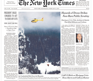 A dramatic photo of Lindsey Vonn on the front page of the New York Times this morning. The Olympian was airlifted off an Austrian mountain after she crashed during Tuesday’s Alpine world championships. Vonn tore two knee ligaments, injuries that will end her season this year. Onlookers say Vonn’s “right knee bent awkwardly as she landed a jump before she somersaulted down the mountain.” VIDEO