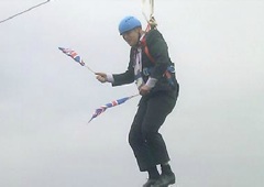 London’s Mayor Boris Johnson became the event to watch yesterday after he got stuck on a zipline while promoting the Olympic celebrations. The Wall Street Journal says he was in good spirits as he dangled in a blue harness while onlookers snapped photos, at one time joking to the crowd beneath: “Get me a rope? Get me a rope, okay?” VIDEO