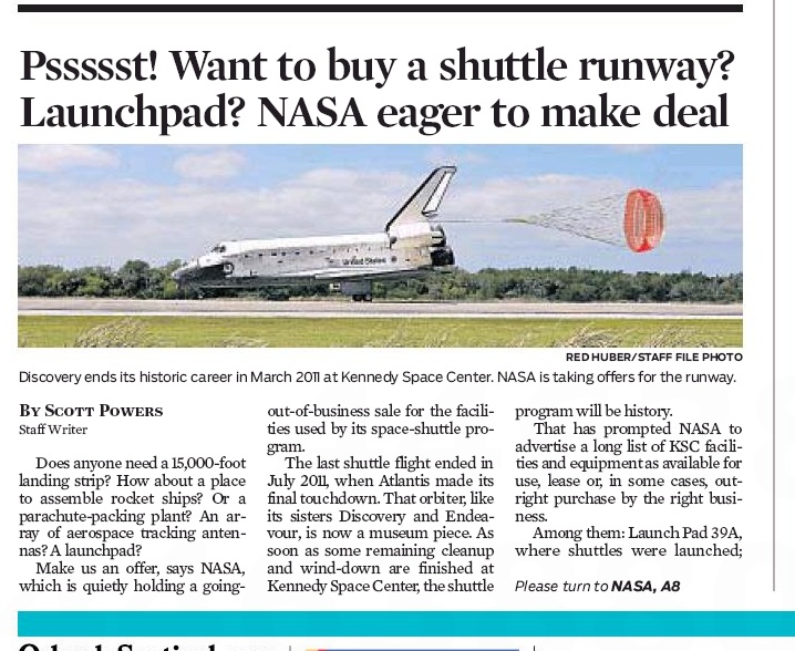 Anyone in the market for a 15,000-foot landing strip? A rocket ship assembly plant? A launch pad? The Orlando Sentinel says NASA is quietly selling off accoutrement from its space-shuttle program at Kennedy Space Station to the highest bidder. Most of the stuff has to go by the end of 2013 when federal maintenance money will run out.