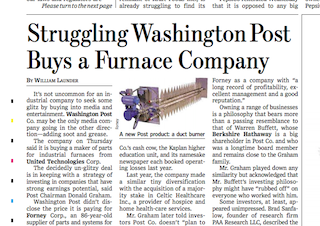 How tough is the newspaper business these days? Consider this: The Washington Post bought a furnace-making company yesterday to diversify. The Wall Street Journal says it follows the company’s recent strategy of investing where there’s “strong earnings potential.” Last year, the Post bought into a provider of hospice and home health-care services. Some investors were unhappy with the decision, however strategic, saying the move was “well outside of their core competencies.”