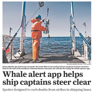 Smartphones are being put to use on the high seas. Marine biologists in San Francisco are testing a new app that tracks the location of whales to help ship captains avoid hitting them. Whale Spotter uses GPS to track locations where whales have been seen. The Coast Guard would be able to use the information to reroute shipping traffic.