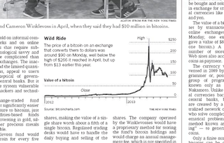 In a sidebar to an article about the Winklevoss twins in this morning’s paper, the New York Times explains very concisely what bitcoins are. First of all, they aren’t coins at all. The virtual currency is defined as “one type of a digital math-based asset that is issued by, and transmitted through, an open source, cryptographic protocol platform known as the bitcoin network.” Huh? Basically, it’s “digital money that you cannot hold, but can be bought and sold online in exchange for traditional currencies like dollars and yen.”