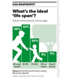 How long do you want to live? USA Today’s Snapshot Infographic details the ideal life span for Americans. Only 8 percent of us want to live to more than 100. The 81 to 90 years category was most popular. For the record, a girl born in the U.S. today can expect to live to age 81 and a boy to 76.