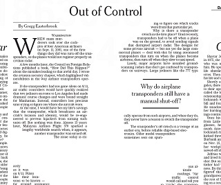 Since the disappearance of Malaysia Airlines Flight 370, one of the thoughts I’ve had is why a transponder can be turned off in the first place. Gregg Easterbrook writes an Op-Ed in the New York Times asking the same question. He says transponders should have been re-engineered after the September 11th attacks so they could not be manually turned off. Only a hijacker would want to turn off a transponder.