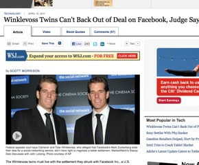 The judge called it a case of “settler’s remorse.” The Wall Street Journal says the Winklevoss twins just lost an appeal to rejigger their settlement with Facebook. Concluding that “at some point, litigation must come to an end,” the judge said the twin’s must live with the $20 million in cash and $45 million in Facebook stock they received back in 2008. The brothers, whose fight was the premise of “The Social Network,” contend that they were misled about the real value of Facebook at the time of their initial settlement.