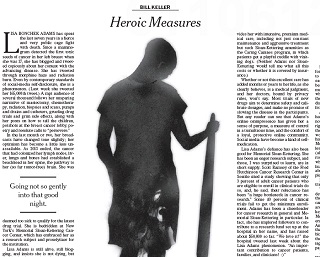 Bill Keller writes an Op-Ed in the New York Times about one woman’s very public battle against cancer. Lisa Adams has tweeted about her condition more than 165,000 times. She is, Keller says, a warrior doing battle against the disease. But Keller says praise is also due to those who choose to forgo aggressive treatments so they may go gently. Keller’s wife was criticized for her take on Adams’ case in the Guardian.