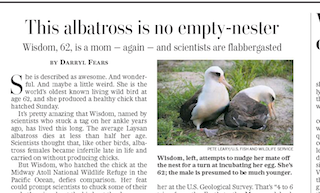 According to the front page of the Washington Post this morning, the oldest (known) bird has stunned scientists by having a baby. Wisdom, a 62-year-old albatross, shocked everyone when she gave birth to a healthy chick over the weekend. It was previously thought that albatross females became infertile late in life and Wisdom has already lived about 30 years longer than the average. So who’s the father? The word on the street is that he’s much younger.