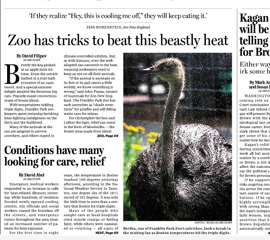 Here’s something I did not do in an attempt to cool down yesterday: suck on a blood Popsicle. The Boston Globe says that’s how the big cats at a local zoo beat the heat yesterday. Zookeepers have to think of innovative ways to keep their charges cool when the temperature soars. Even animals who are designed to withstand sweltering weather can fall victim to heat-related injuries. I’d also pass on the frozen bugs, though a mist bath sounds like it might be quite nice.